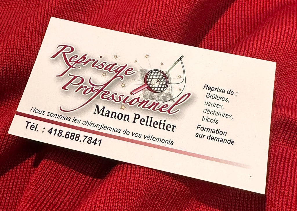 Pour bénéficier des services de réparation de Manon Pelletier, vous pouvez la contacter au 418-688-7841. N'hésitez pas à lui confier vos vêtements endommagés, elle saura les restaurer avec soin et précision.